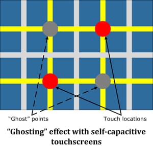 Electrodes are laid out in a 2-layer grid and measurements are taken not from an electrode intersection , but from a row and column electrode pair. This presents a problem for multi-touch functionality. When the screen is touched at two different locations, there are two sets of possible points that can be interpreted by the touch device (this forms a rectangle, with each pair on a diagonal), with no way for software to resolve which pair corresponds to the actual locations touched. The two false locations are called "ghost points". Fortunately, many multi-touch gestures (such as a "pinch") are insensitive to this effect.