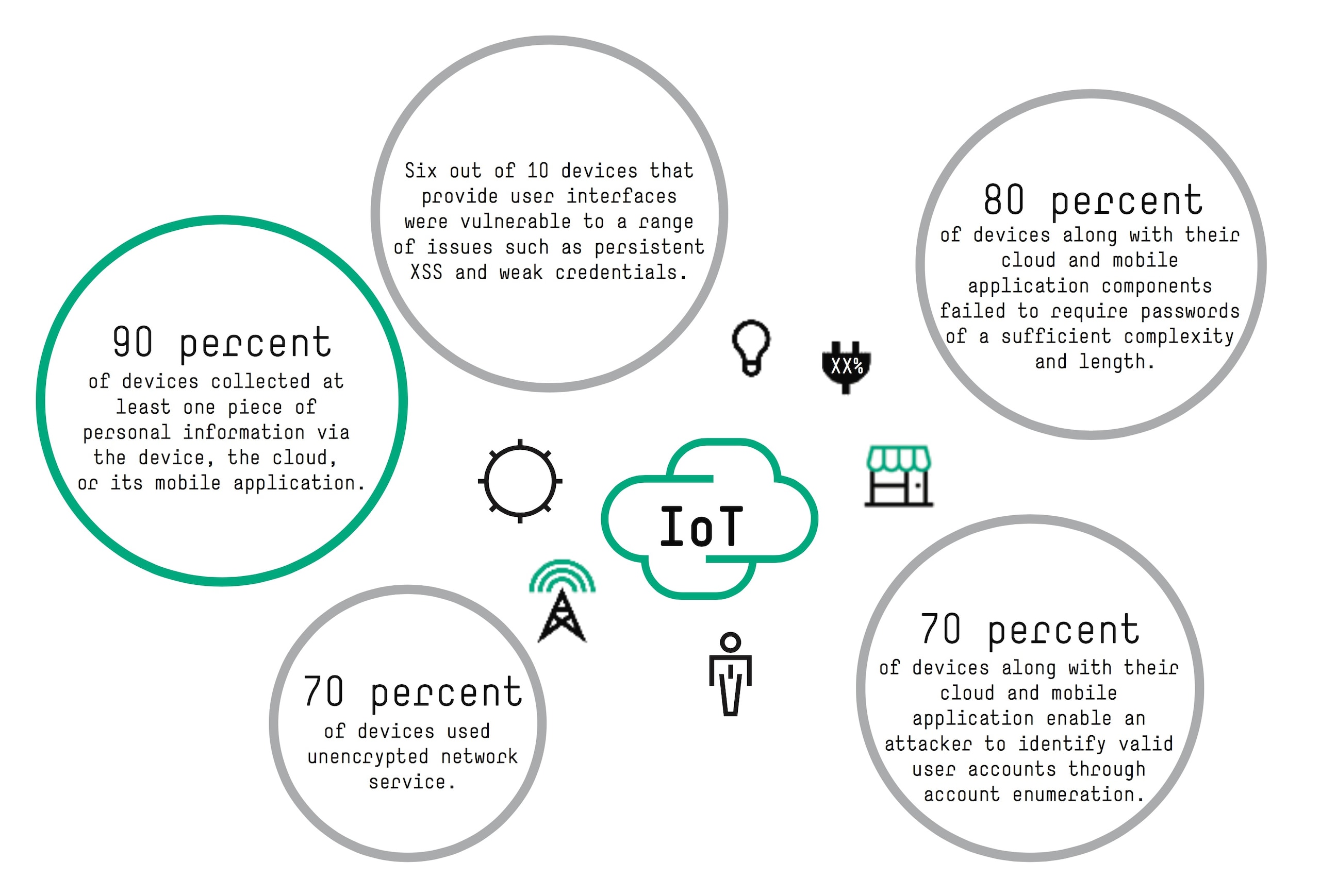 It’s a problem that’s only going to get worse as the IoT rolls out. A report published in late 2015 by Hewlett Packard Enterprise, for example, concluded 70 percent of the most commonly used IoT devices showed serious security deficiencies. The report also noted 90 percent of IoT devices collected at least one piece of personal information. (See figure.)