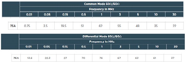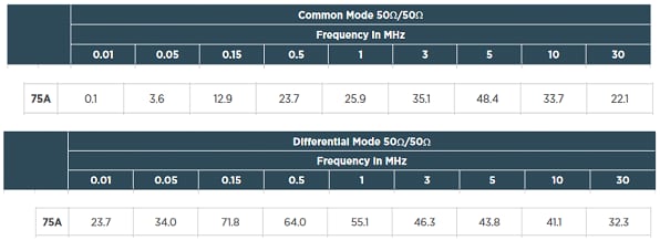 Figure 7: The common- and differential-mode attenuation (in dB) from 0.01 to 30MHz for a 75A, single-stage Corcom AHV-series filter is high. (Source: TE Connectivity)