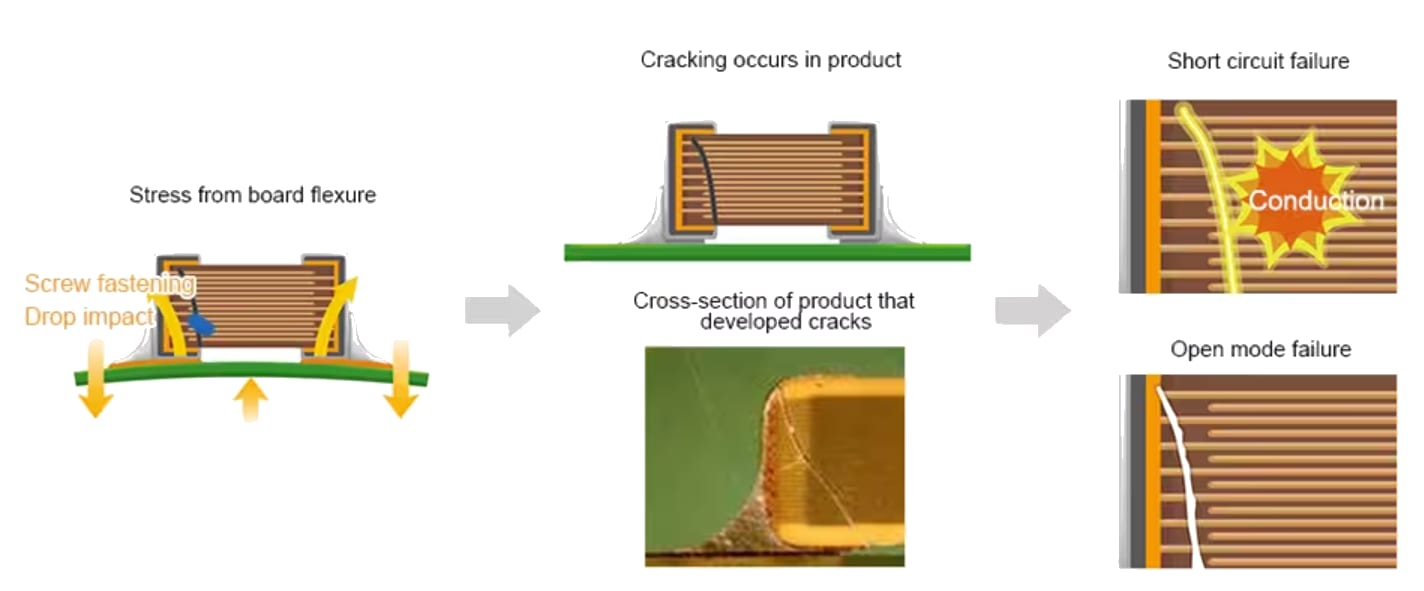 Figure 1: The main causes of flex cracks and the process of flexing the PCB. (Source TDK)