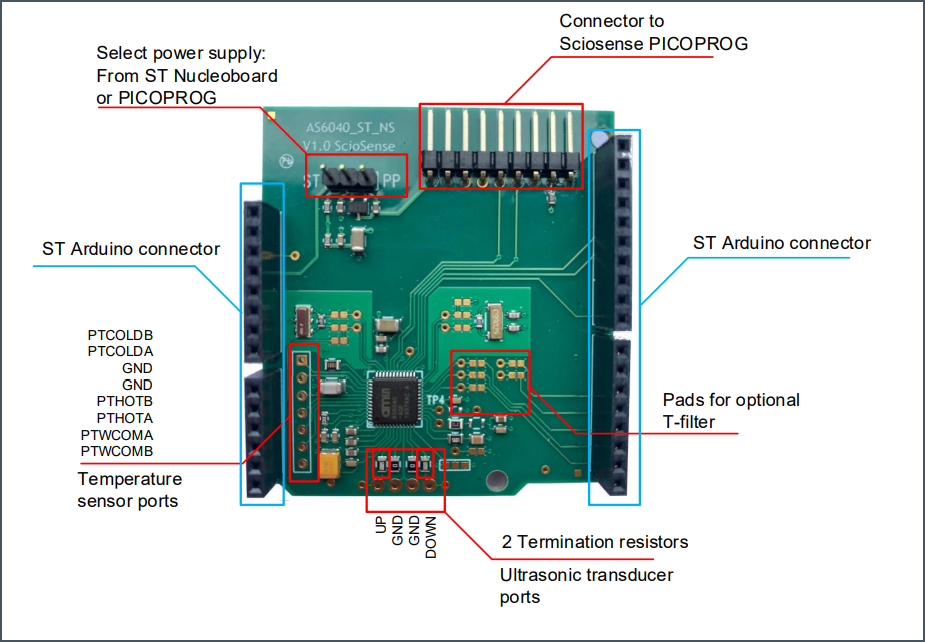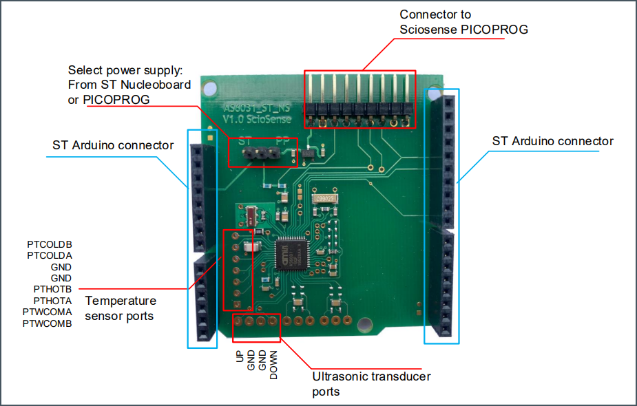 ScioSense UFC ST Nucleo Shields Expansion Boards can easily be combined with ST development kits and ScioSense evaluation kits. The boards feature two rows of connectors that fit into the ST Nucleo boards. An additional connector is available to use with the PICOPROG interface. Shields are available for TDC-GP30YA-F01 (with flow firmware), AS6031, and AS6040.